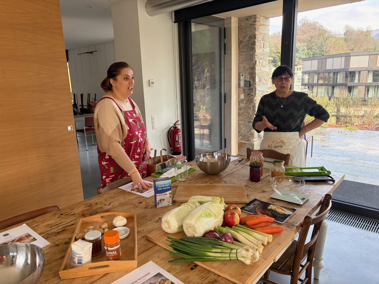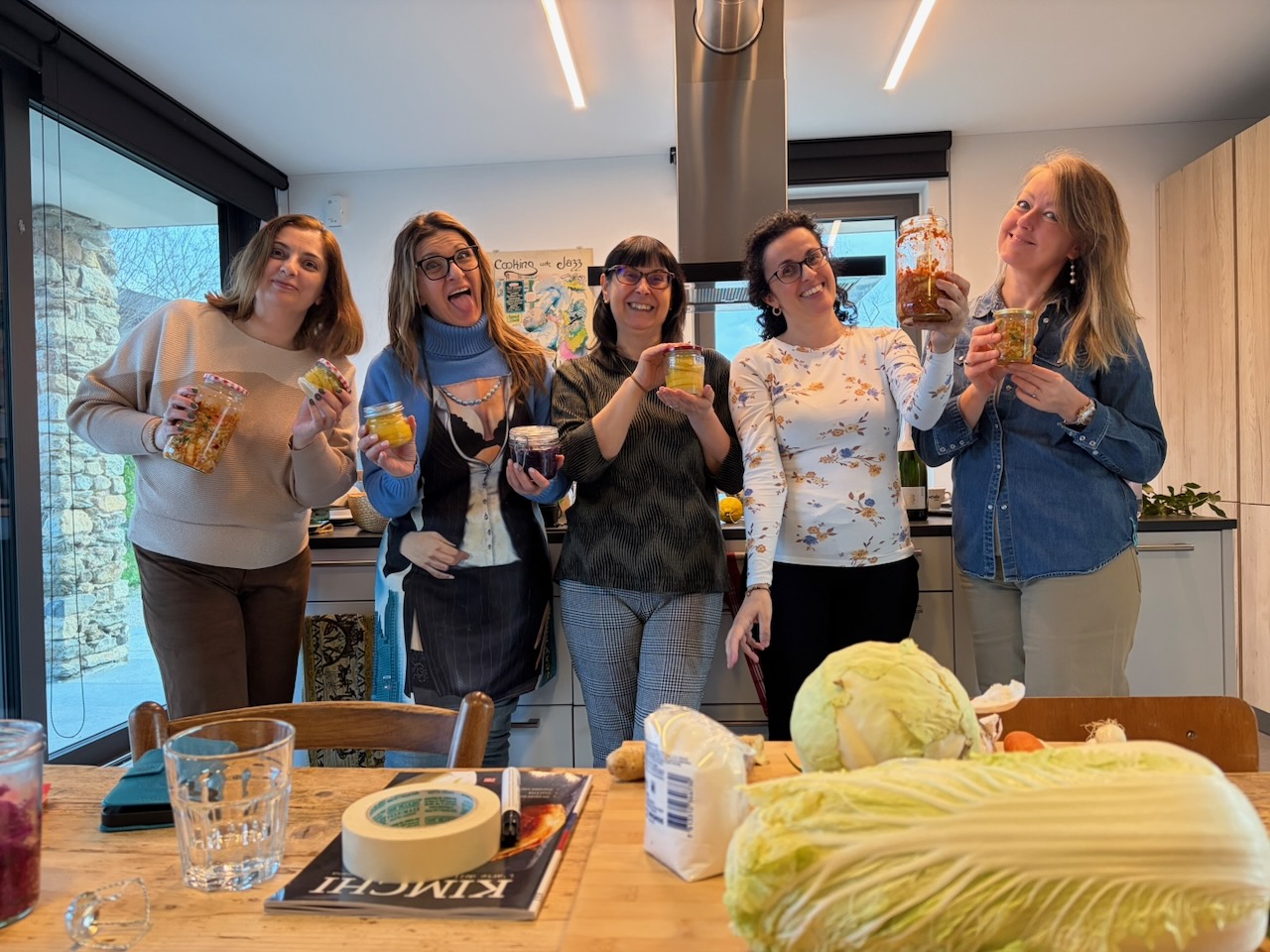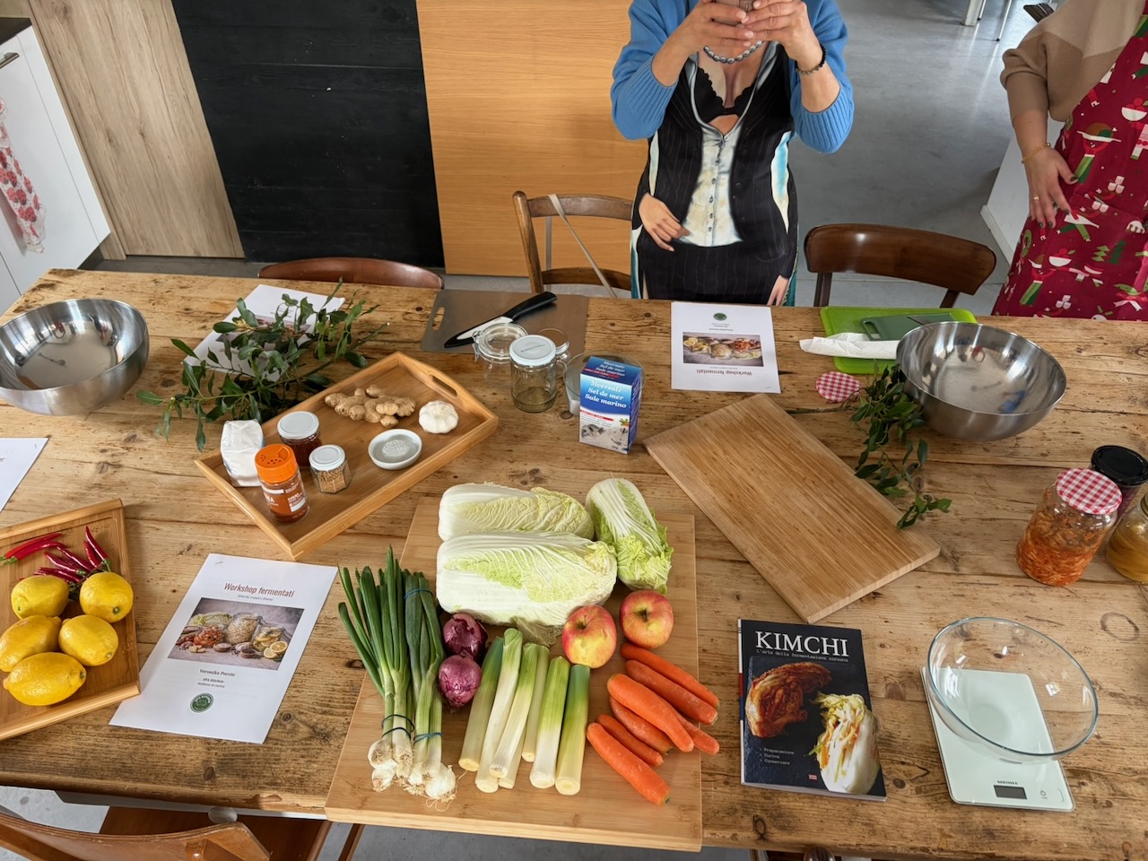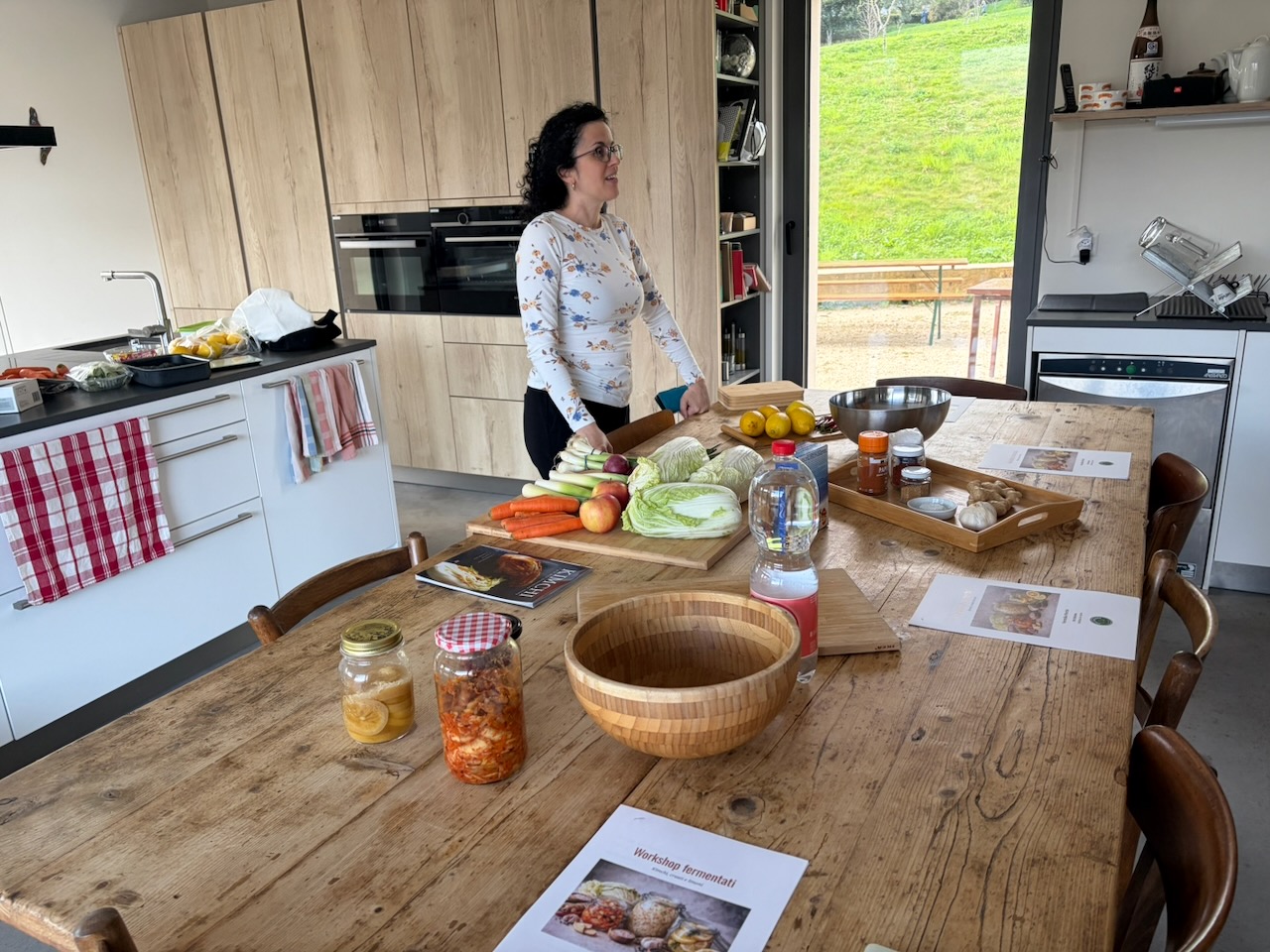 Questo secondo appuntamento è stato come ritrovare un’atmosfera familiare, ma con un’energia nuova, vibrante come i colori dei nostri fermentati. Se il primo incontro sapeva di “arrivederci”, questo ha confermato che la strada intrapresa è quella giusta: un percorso fatto di curiosità sincera e della voglia di riscoprire gesti antichi in chiave moderna. Questa volta il cuore dell’evento è stato un viaggio tra profumi intensi e consistenze croccanti. Vedere il gruppo di amiche immergersi con così tanto entusiasmo nella preparazione del Kimchi, dei crauti rossi e dei limoni fermentati mi ha riempito di gioia.