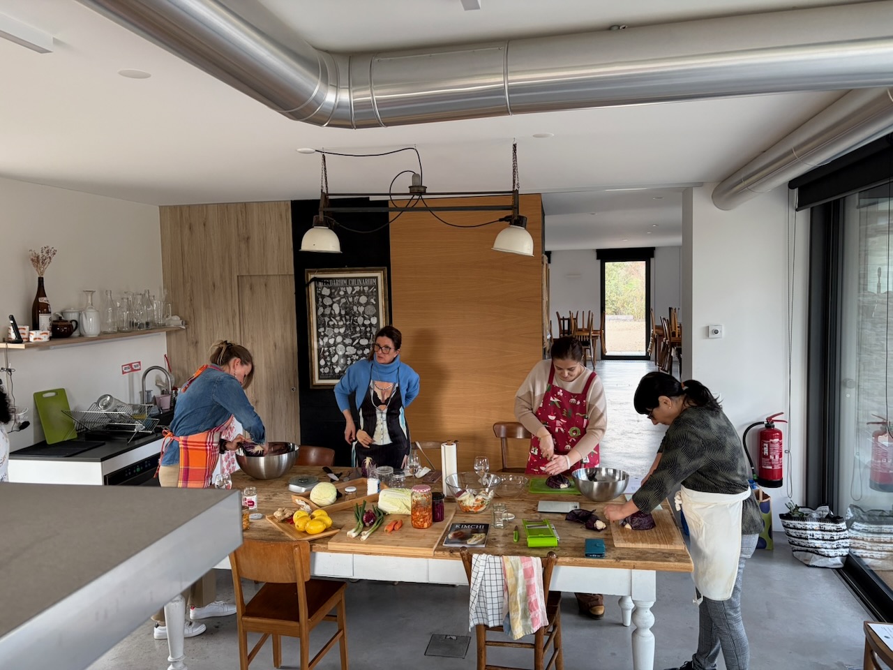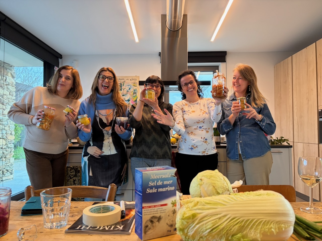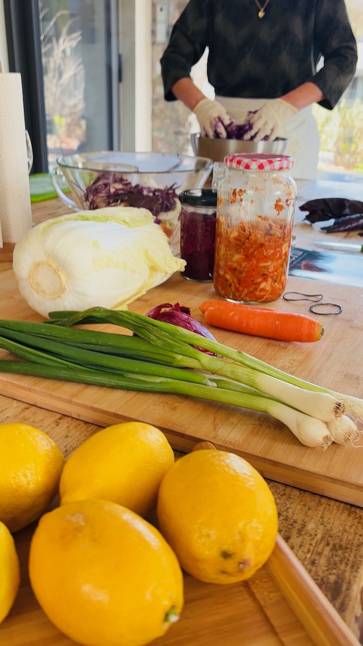 Ho voluto creare un pomeriggio dedicato all’arte della conservazione naturale, un viaggio tra sapori decisi e gesti antichi. Insieme a un gruppo di amiche, abbiamo esplorato il mondo dei fermentati dando risalto a tre ricette speciali: il Kimchi, i crauti e i limoni. La vera star della giornata è stata senza dubbio il Kimchi, che ha acceso la curiosità di tutte per la sua complessità e il suo carattere vibrante. Abbiamo alternato momenti di teoria e consigli alla preparazione pura, sporcandoci le mani e imparando a rispettare i tempi della natura. A fare da cornice a questo splendido pomeriggio di gusto orientale ci siamo regalate un assaggio finale: un hummus di ceci con limoni fermentati, da gustare insieme alla mia black focaccia con kimchi e crauti (entrambi preparati in precedenza), il tutto accompagnato da un buon bicchiere di prosecco per brindare alla bellezza dello stare insieme.