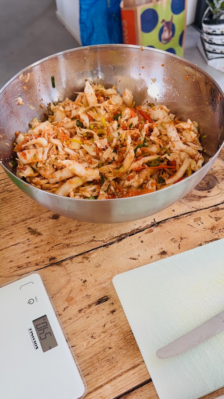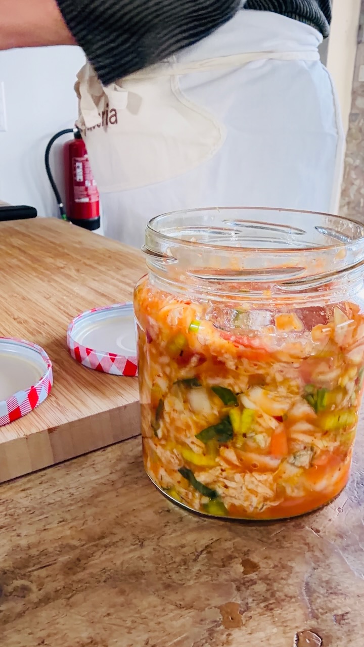 Durante il workshop abbiamo dedicato tempo a ogni singolo passaggio, trattando le materie prime con estremo rispetto. Abbiamo curato ogni foglia e riscoperto il valore dell’ utilizzo delle mani: un gesto quasi meditativo che, ammorbidendo le verdure, permette alle spezie di penetrare in profondità, sprigionando un cuore di sapori autentici. Ho voluto condividere la mia ricetta personale, frutto di prove e aggiustamenti, per assicurarci che ogni barattolo preparato insieme racchiudesse l’autentico spirito coreano, ma con quel tocco SPA Kitchen che cerca sempre l’equilibrio perfetto tra piccantezza, acidità e croccantezza. Vedere i barattoli riempirsi di colore è stata la chiusura perfetta di un cerchio fatto di pazienza e passione.